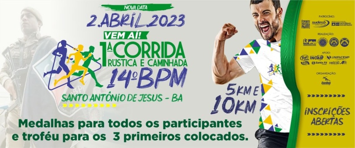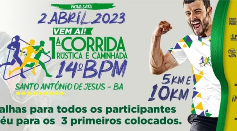 A Polícia Militar da Bahia (PMBA) convida a comunidade, pms e familiares para participar da 1ª Corrida Rústica e Caminhada do 14º Batalhão de Polícia Militar (BPM) em 2 de abril, no município de Santo Antônio de Jesus.