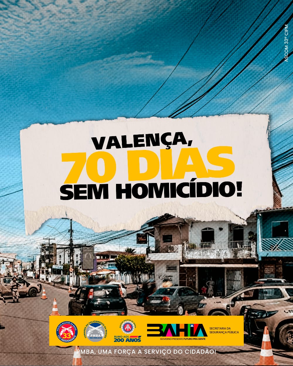 Graças a todo empenho, profissionalismo e dedicação de toda a Tropa da 33ª CIPM, a cidade de Valença hoje soma 70 dias sem homicídios!