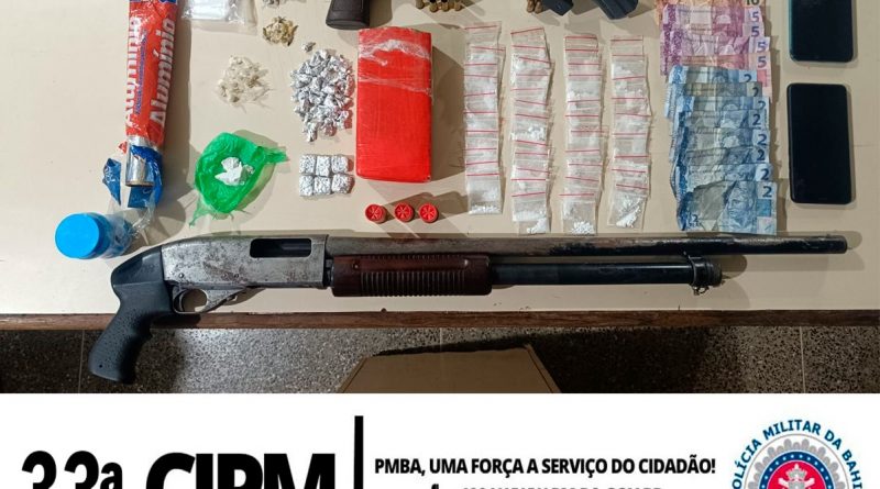 01 escopeta calibre .12, 01 Pistola 938, 01 revolver calibre .38, 04 munições .380 intactas, 02 (duas) munições de calibre .38 intactas e 05 deflagradas, 03 munições de calibre .12, 01 mochila preta contendo grande quantidade de drogas, sendo 42 pacotes, 07 papelotes e 01 pedra de substância com características de cocaína, 72 pedras de substância com características de crack, 30 papelotes e 01 tablete de substância com características de maconha, 100 (cem) sacos plásticos e de alumínio, R$86,00 aparelhos de celular.