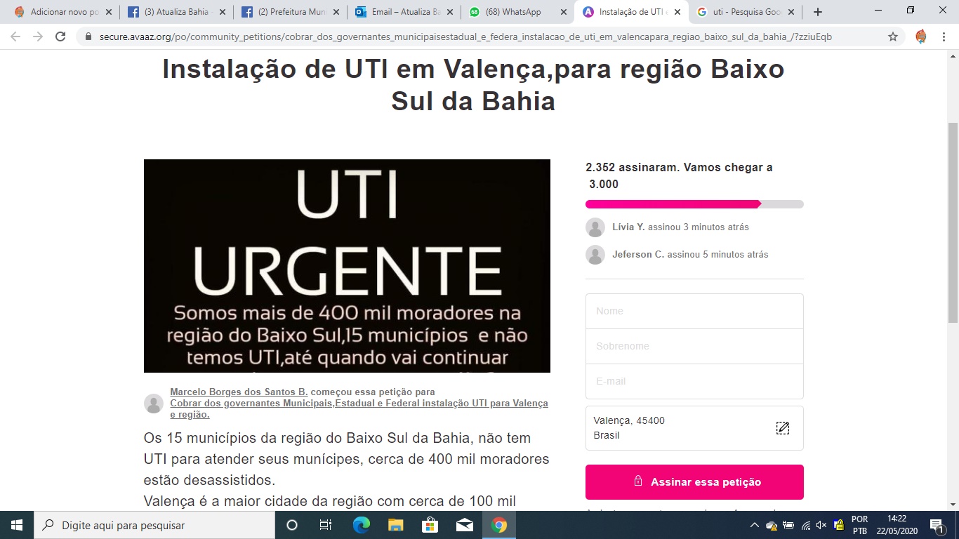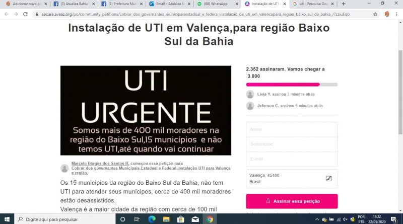 Iniciado por Marcelo Borges, o abaixo assinado solicitando a implantação de uma Unidade de Terapia Intensiva em Valença já chega a mais de 2300 assinaturas. O abaixo assinado foi criado no dia 17 de maio devido a falta do equipamento no Baixo Sul, região composta por 15 municípios e cerca de 400 mil habitantes, sendo que só Valença tem 100 mil.