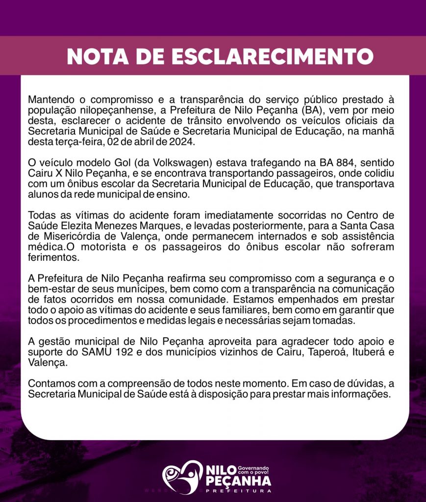 Na manhã desta terça-feira (02), ocorreu um acidente automobilístico na BA 001 em uma curva próximo à cidade de Nilo Peçanha. A colisão frontal envolveu um veículo VW Gol, branco, que presta serviço a Secretaria de Saúde e um ônibus escolar(amarelinho), ambos do referido município.