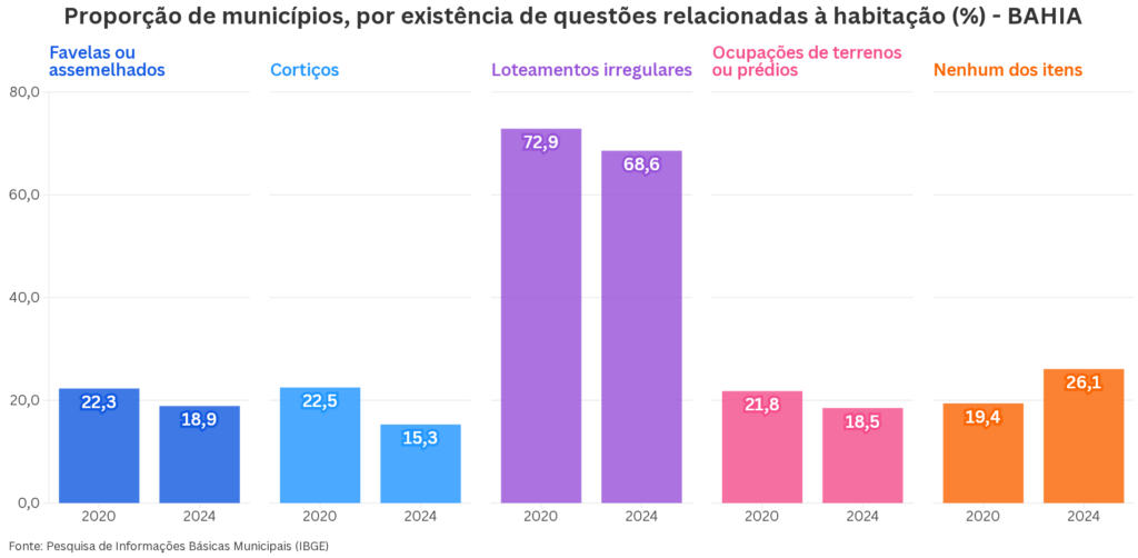 Em 63 municípios da Bahia (15,1%), existia, em 2024, alguma política de gratuidade total no transporte coletivo, sendo que em 33 (7,9% do total) isso ocorria todos os dias. Nacionalmente, 650 cidades (11,7%) tinham gratuidade todos os dias, no transporte coletivo .Entre 2020 e 2024, o número de municípios baianos com ciclovia passou de 79 para 87, o que representou um crescimento de 10,1% no período. O aumento na Bahia foi superior ao nacional. No país como um todo, o número passou de 1.163 para 1.233 cidades com ciclovias (+6,0%).Em 4 anos, Bahia tem queda no número de municípios com favelas (-15,1%), cortiços (-31,9%), loteamentos irregulares (-5,9%) e ocupações (-15,4%)Entre 2020 e 2024, o número de municípios baianos com favelas, mocambos, palafitas ou assemelhados caiu de 93 para 79. A redução proporcional (-15,1%) foi bem superior à nacional (-3,1%, de 1.049 para 1.016) e a 5ª mais expressiva entre os estados, inferior somente às registradas em Mato Grosso (-57,1%), Alagoas (-32,4%), Rio Grande do Sul (-26,8%) e Santa Catarina (-17,6%).Ainda assim, em 2024, na Bahia, 18,9% dos municípios possuíam favelas ou assemelhados, em uma proporção um pouco superior à nacional (18,2%) e a 13ª maior dentre os 26 estados.Além do recuo na proporção dos municípios com favelas, entre 2020 e 2024, também caíram os totais de cidades com cortiços, loteamentos irregulares e ocupações.O total de municípios baianos com cortiços, casas de cômodos ou cabeças de porco diminuiu de 94 para 64 (-31,9%), na 4ª maior redução percentual do país. Nacionalmente, o número passou de 865 para 785 (-9,2%). As cidades da Bahia com loteamentos irregulares e/ou clandestinos passaram de 304 para 286 (-5,9%), na 3ª maior redução proporcional entre os estados, inferior apenas às registradas em Alagoas (-7,8%) e Pernambuco (-7,1%). Nacionalmente, houve crescimento de 0,8%, chegando a 3.737 municípios.E os municípios com ocupações de terrenos ou prédios por movimentos de moradia na Bahia, que eram 91 em 2020, passaram a ser 77 em 2024 (-15,4%), na 8ª principal redução proporcional entre os estados. No Brasil como um todo, esse número também teve queda (-7,9%) e chegou a 791.Com isso, na Bahia, o número de municípios que não possuíam favelas, cortiços, loteamentos irregulares e ocupações cresceu entre 2020 e 2024, passando de 81 para 109 (+34,6%), no 6º maior aumento entre as unidades da Federação. No país como um todo, o crescimento foi de 6,3%, de 1.467 para 1.559.Os 109 municípios baianos que não possuíam favelas, cortiços, loteamentos irregulares e ocupações representavam 1 em cada 4 do total do estado (26,1%), a 14ª maior proporção. O ranking era liderado por Piauí (57,6%), Rio Grande do Norte (38,9%) e Tocantins (36,7%). Nacionalmente, a proporção é de 28,0%.