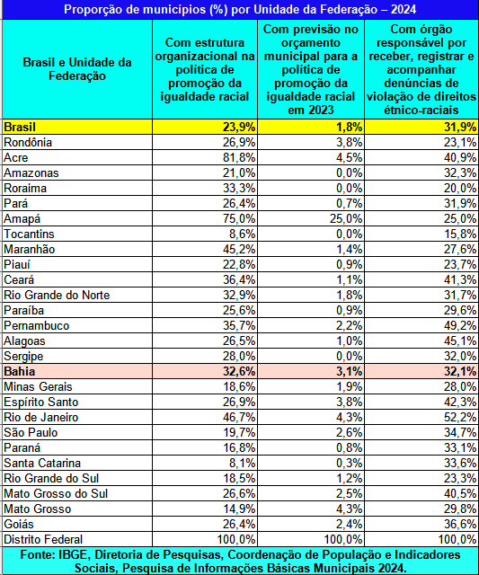 Em 2024, a Bahia era o estado brasileiro com maior participação de pessoas pretas (24,4%) e a segunda maior proporção de pessoas pretas ou pardas (80,7%) na população – neste último caso, abaixo apenas do Maranhão (81,7%). Entretanto, no mesmo ano, apenas 136 dos 417 municípios baianos (32,6% ou 1 em cada 3) possuíam alguma estrutura organizacional atuando na política de promoção da igualdade racial, fossem secretarias exclusivas, setores subordinados a outras secretarias ou diretamente aos Executivos municipais.Embora bem inferior à metade, a proporção de municípios com estrutura para a promoção da igualdade racial na Bahia (32,6%, ou 1 em cada 3) era superior à do Brasil como um todo, onde 23,9% das prefeituras (ou 1 em cada 4) apresentavam algum tipo de órgão com esse objetivo (1.331 dos 5.570 municípios do país).Considerando os 26 estados (excluindo-se o Distrito Federal), a Bahia tinha apenas a 9ª maior proporção de municípios com estrutura para a promoção da igualdade racial. Acre (81,8%), Amapá (75,0%) e Rio de Janeiro (46,7%) lideravam esse ranking. Por outro lado, Santa Catarina (8,1%), Tocantins (8,6%) e Mato Grosso (14,9%) apresentavam os menores índices.
