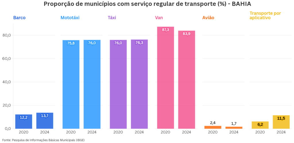 Em 2024, 67 dos 417 municípios baianos (16,1%) possuíam programas e/ou ações voltadas aos povos ciganos. A proporção era a 6ª maior do país e superior à nacional (12,4%). Rio de Janeiro (25,0%), Ceará (17,9%) e Pernambuco (17,8%) tinham as maiores proporções de municípios que realizavam algum tipo de ação voltada para essa população. Na Bahia, a maioria das cidades (60) realizavam ações na área da assistência social. Na sequência, vinham ações em saúde (por 40 cidades) e educação (39).A Bahia é o 2º estado com o maior número de municípios com acampamentos ou ranchos ciganos permanentes (35), atrás apenas de Minas Gerais, com 44.Entre 2020 e 2024, número de municípios da Bahia com transporte por aplicativo cresceu 84,6% e chegou a 48, 11,5% do totalEm 2024, 48 dos 417 municípios baianos possuíam serviço de transporte por aplicativo (como Uber, 99Taxi e outros). A proporção (11,5% do total) era bastante inferior à do Brasil como um todo (26,3%), sendo a 8ª menor do Brasil.Em quatro anos, porém, o número de cidades da Bahia com este tipo de serviço cresceu de forma significativa, aumentando 84,6% frente a 2020, quando havia transporte por aplicativo em 26 municípios no estado.Nacionalmente, entre 2020 e 2024, houve um crescimento de 66,9% no número de municípios com serviço de transporte por aplicativo, passando de 878 para 1.465. A Bahia teve o 12º maior crescimento, em um ranking liderado por Tocantins (+266,7%), Roraima (+200,0%) e Pernambuco(+150,0%).Em relação a outros meios de transporte investigados, houve pouca mudança na Bahia, entre 2020 e 2024. Verificaram-se leve queda no número de municípios com serviço de van (de 364 para 350, -3,8%) e discretas altas na quantidade de cidades com táxi (de 317 para 318, +0,3%) e mototáxi (de 316 para 317, +0,3%).O número de cidades baianas sem nenhum dos tipos de transportes investigados também cresceu entre 2020 e 2024, passando de 12 para 19 (+58,3%). Esse número representa 4,6% dos municípios da Bahia, em um índice inferior ao nacional (8,1%).