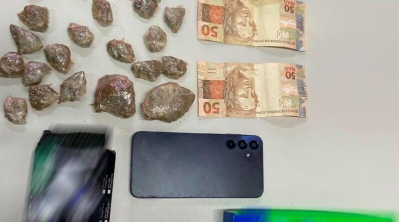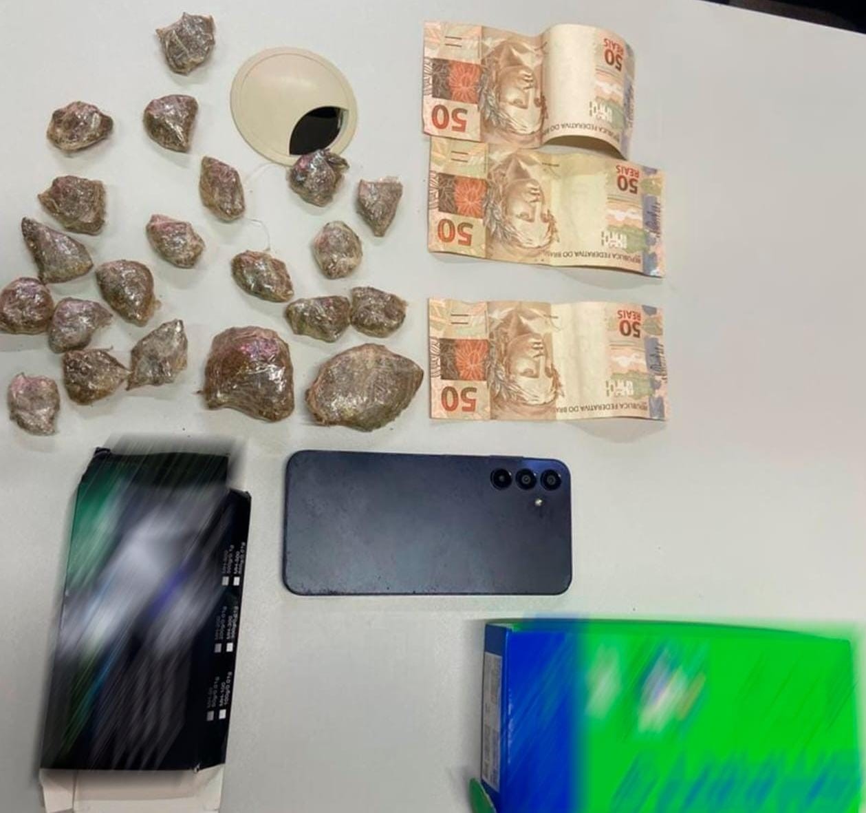 Na caixa continha 22 porções de maconha, 1 aparelho celular e R$ 150,00 em espécie e uma embalagem de uma balança de precisão.