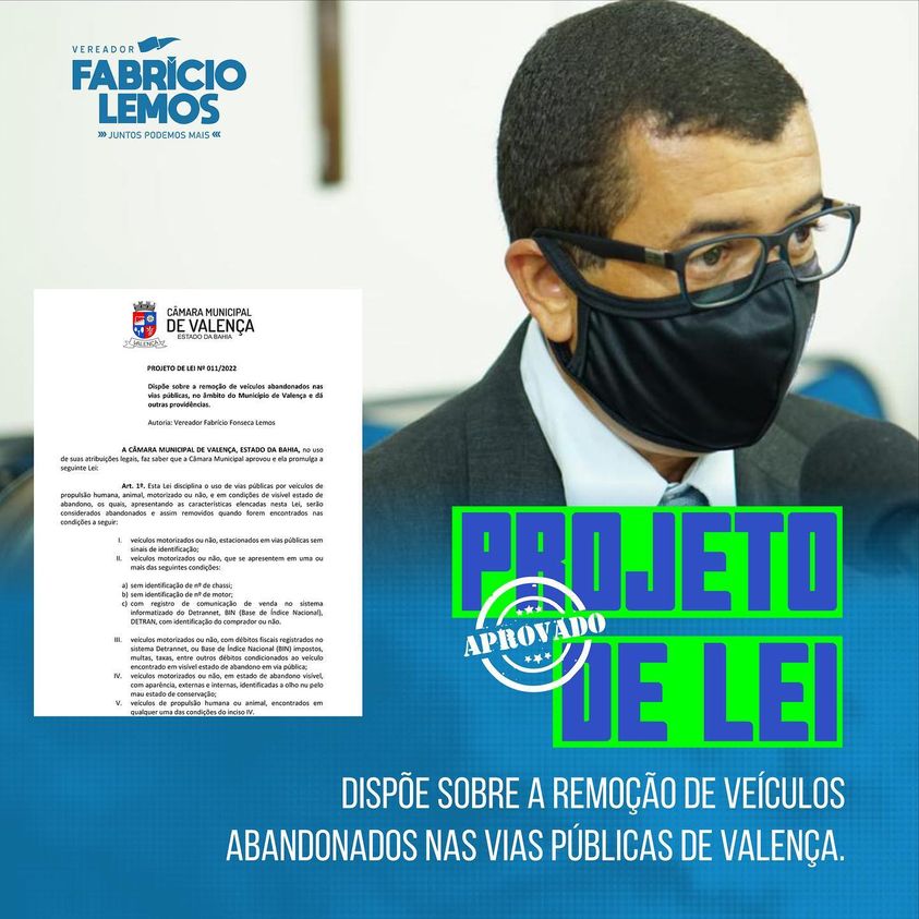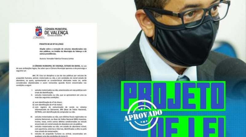 Aprovado em 2ª votação – PROJETO DE LEI do Vereador Fabrício Lemos; dispõe sobre a remoção de veículos abandonados nas vias públicas