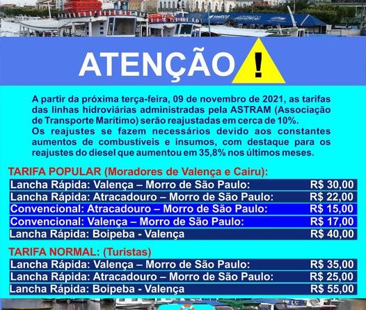 A partir desta terça-feira (09), as tarifas das linhas hidroviárias administradas pela ASTRAM (Associação de Transporte Marítimo) serão reajustadas.