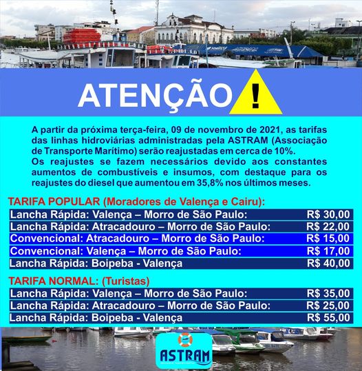 A partir desta terça-feira (09), as tarifas das linhas hidroviárias administradas pela ASTRAM (Associação de Transporte Marítimo) serão reajustadas.