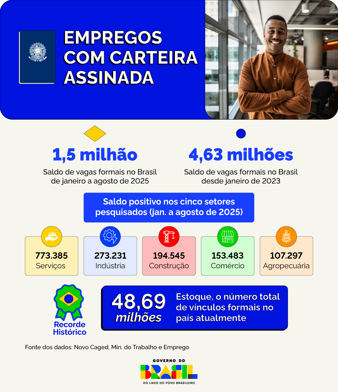 NACIONAL – O Brasil superou 1,5 milhão de novos empregos com carteira assinada nos oito primeiros meses de 2025. Entre janeiro e agosto, foram criados 1.501.930 vínculos formais, com saldo positivo nos cinco grandes grupamentos de atividades econômicas. O resultado eleva para 48,69 milhões o estoque de vínculos no país, um recorde absoluto. Desde o início da atual gestão do Governo do Brasil, em janeiro de 2023, o saldo é de 4,63 milhões de vagas com carteira assinada.