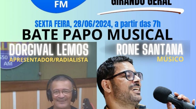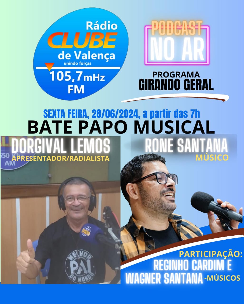 Nesta sexta-feira (28), a partir das 7:00h, o cantor Rone Santana participará do programa Girando Geral, com Dorgival Lemos, na Rádio Clube de Valença. O programa tem um novo quadro, o Bate Papo Musical em que convida toda semana uma nova atração. Desta vez terá como convidado o musico Rone Santana, além de Reginho Cardim e Wagner Santana.