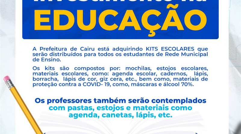 Em uma iniciativa pioneira da Prefeitura de Cairu, através da Secretaria de Educação, o prefeito Hildécio Meireles determinou a compra de KITS ESCOLARES que serão distribuídos para todos os estudantes de Rede Municipal de Ensino. Os kits são compostos por: mochilas, estojos escolares, materiais escolares, como: agenda escolar, cadernos, lápis, borracha, lápis de cor, giz cera, etc., bem como, materiais de proteção contra a COVID- 19, como, máscaras e álcool 70%. Os professores também serão contemplados com pastas, estojos e materiais como agenda, canetas, lápis, etc.
