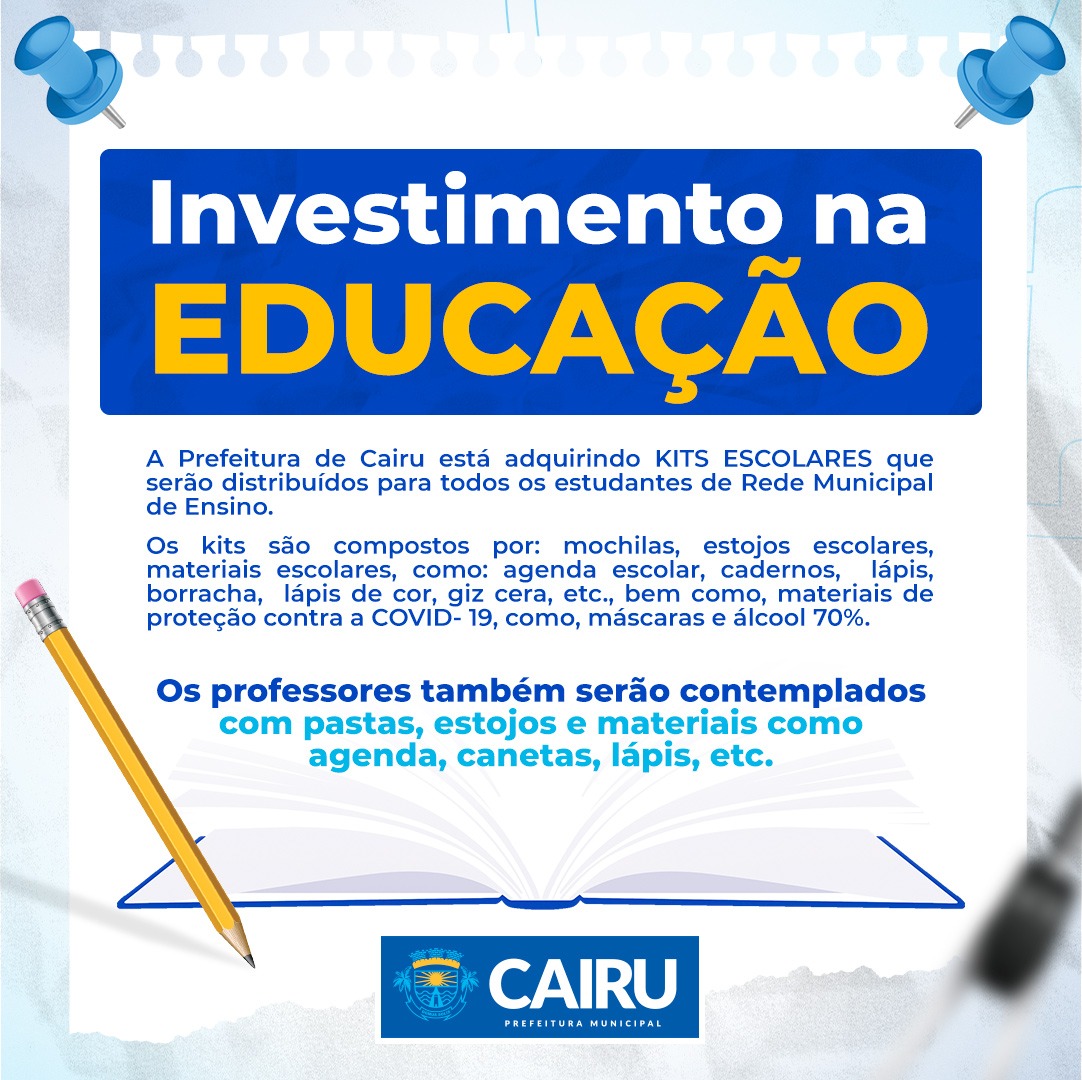 Em uma iniciativa pioneira da Prefeitura de Cairu, através da Secretaria de Educação, o prefeito Hildécio Meireles determinou a compra de KITS ESCOLARES que serão distribuídos para todos os estudantes de Rede Municipal de Ensino. Os kits são compostos por: mochilas, estojos escolares, materiais escolares, como: agenda escolar, cadernos, lápis, borracha, lápis de cor, giz cera, etc., bem como, materiais de proteção contra a COVID- 19, como, máscaras e álcool 70%. Os professores também serão contemplados com pastas, estojos e materiais como agenda, canetas, lápis, etc.