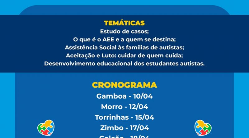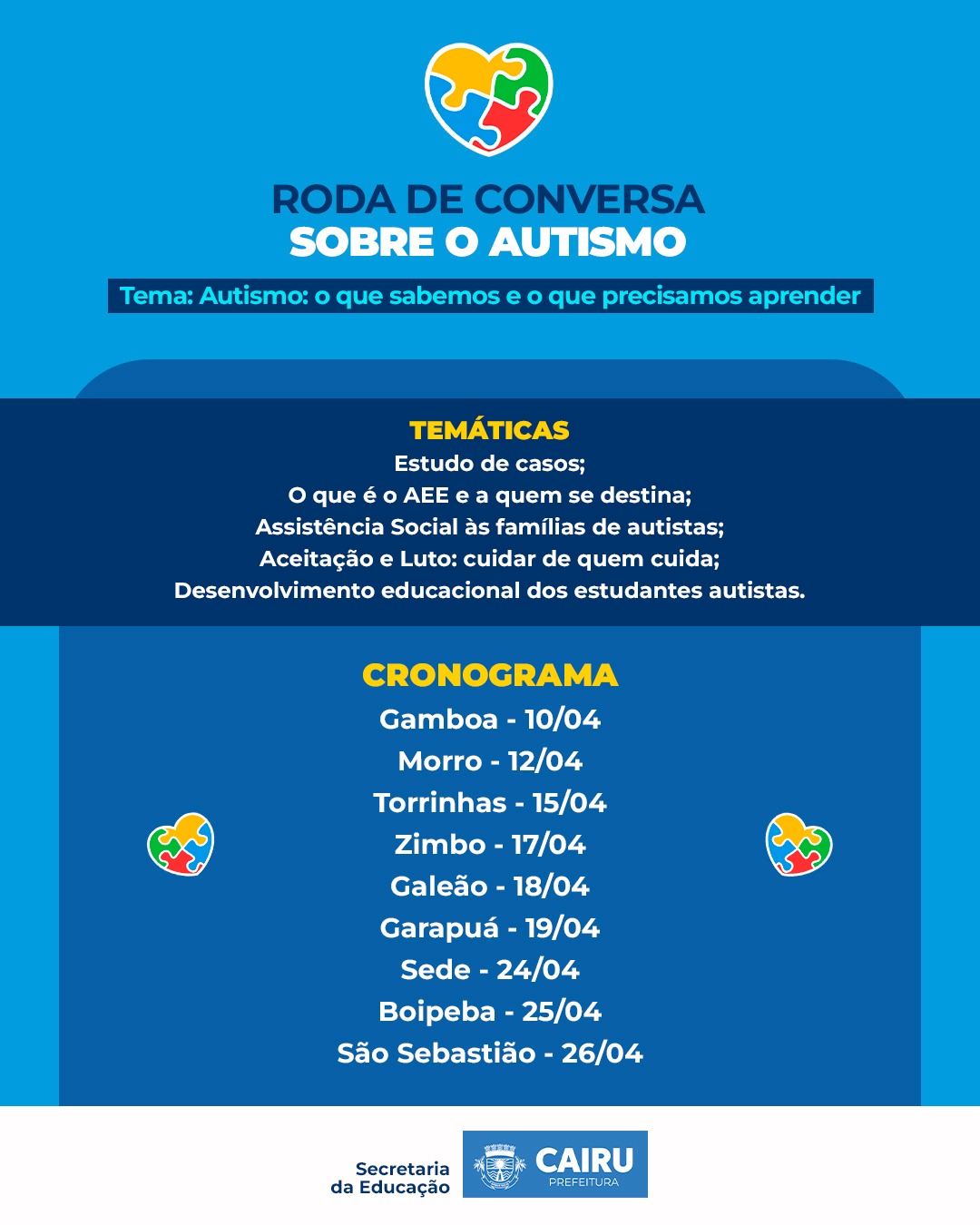A Prefeitura Municipal de Cairu, através da Secretaria Municipal de Educação ainda trabalhando o Abril Azul, campanha de Conscientização sobre o Autismo estará promovendo Rodas de Conversas com pais e profissionais da educação.
