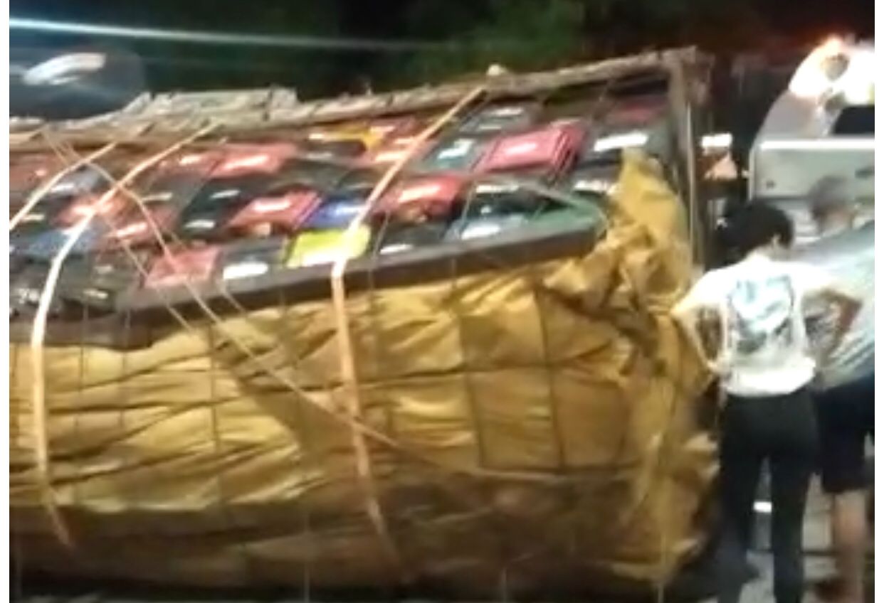 Um caminhão carregado de mangas tombou na noite desta segunda-feira (12), na BR-101, no Entroncamento de Laje.