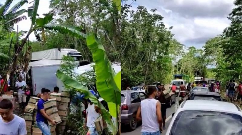 Caminhão tomba na BR-101, próximo a Gandu, e carga de biscoitos é saqueada
