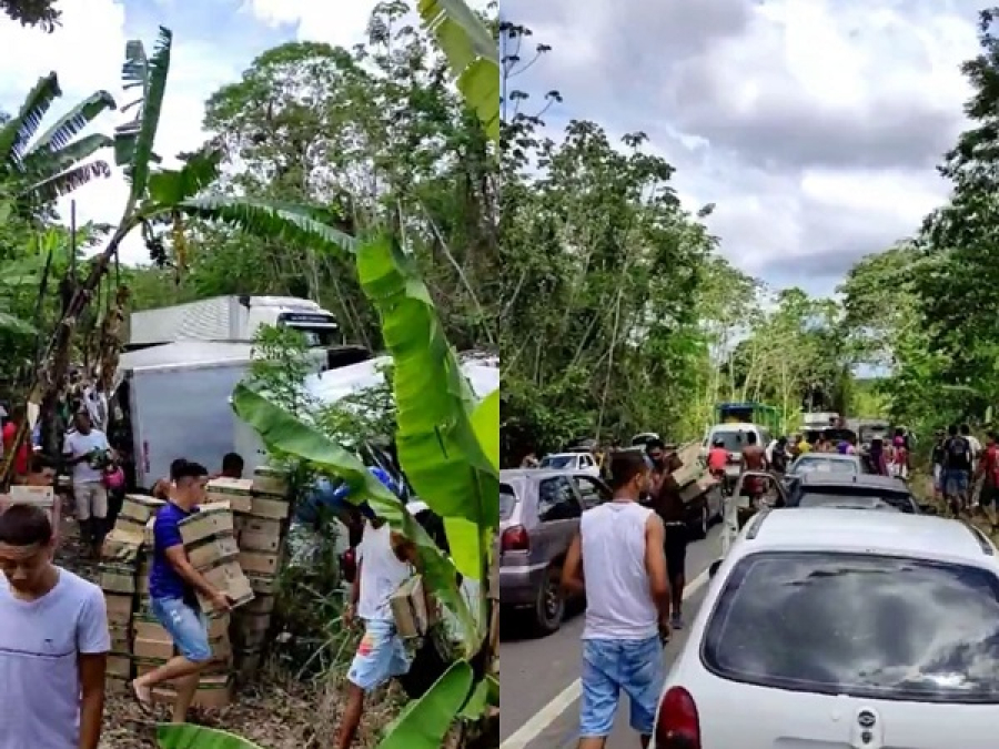 Vídeos compartilhados nas redes sociais mostram populares saqueando a carga que, segundo moradores da região, seria de biscoitos e macarrão.