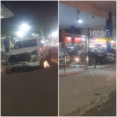 Um carro desgovernado, uma Hilux branca, invadiu o pátio do estabelecimento e colidiu com diversos veículos que estavam estacionados no local.