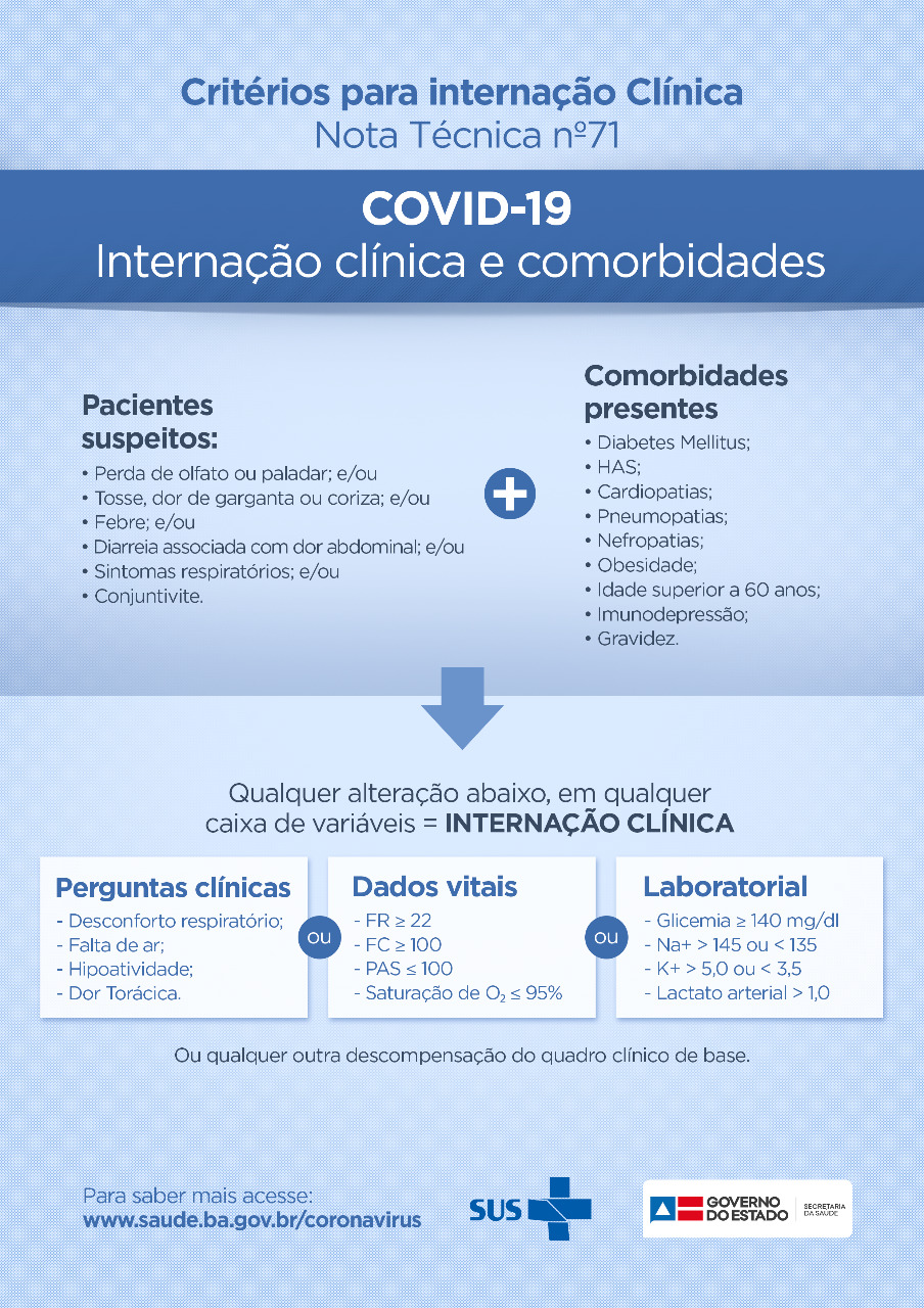 A Nota Técnica 71 está disponível no site www.saude.ba.gov.br/coronavirus e visa orientar, sobretudo, os médicos da rede pública de saúde. Consideram-se casos suspeitos de Covid-19, pessoas que apresentem quaisquer destes sintomas: febre; tosse; coriza; dor de garganta; dispneia; perda de olfato ou paladar; diarréia, associada à dor abdominal e/ou sintomas respiratórios; e conjuntivite.