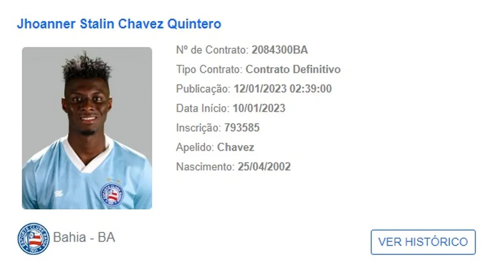 Depois da regularização de Nicolás Acevedo, Jhoanner Chávez teve seu seu nome publicado no Boletim Informativo Diário (BID) da CBF, na tarde desta quinta-feira, e está à disposição do técnico Renato Paiva para vestir a camisa do Bahia. O próximo jogo do Tricolor será neste domingo, contra o Jacuipense, em Riachão do Jacuípe, pela segunda rodada do Campeonato Baiano.