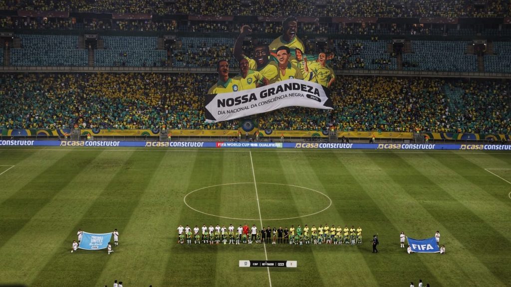 Antes do início da partida entre a seleções masculinas de futebol do Brasil e do Uruguai, pelas eliminatórias da Copa do Mundo de 2026, nesta terça-feira (19), a Casa de Apostas Arena Fonte Nova, em Salvador, foi palco de um importante momento. Em cerimônia, o governador Jerônimo Rodrigues, a ministra das Mulheres, Cida Gonçalves, o presidente da Confederação Brasileira de Futebol (CBF), Ednaldo Rodrigues Gomes, e a secretária de Políticas para as Mulheres da Bahia, Neusa Cadore, formalizaram a assinatura da Carta-Compromisso pelo Feminicídio Zero, além do Acordo de Cooperação Técnica para a implementação do protocolo Não é Não em arenas esportivas.