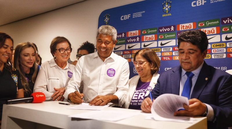 Antes do início da partida entre a seleções masculinas de futebol do Brasil e do Uruguai, pelas eliminatórias da Copa do Mundo de 2026, nesta terça-feira (19), a Casa de Apostas Arena Fonte Nova, em Salvador, foi palco de um importante momento. Em cerimônia, o governador Jerônimo Rodrigues, a ministra das Mulheres, Cida Gonçalves, o presidente da Confederação Brasileira de Futebol (CBF), Ednaldo Rodrigues Gomes, e a secretária de Políticas para as Mulheres da Bahia, Neusa Cadore, formalizaram a assinatura da Carta-Compromisso pelo Feminicídio Zero, além do Acordo de Cooperação Técnica para a implementação do protocolo Não é Não em arenas esportivas.