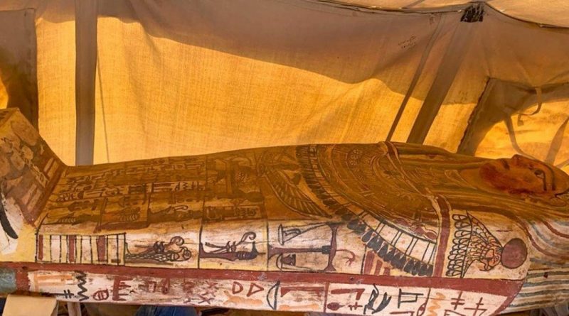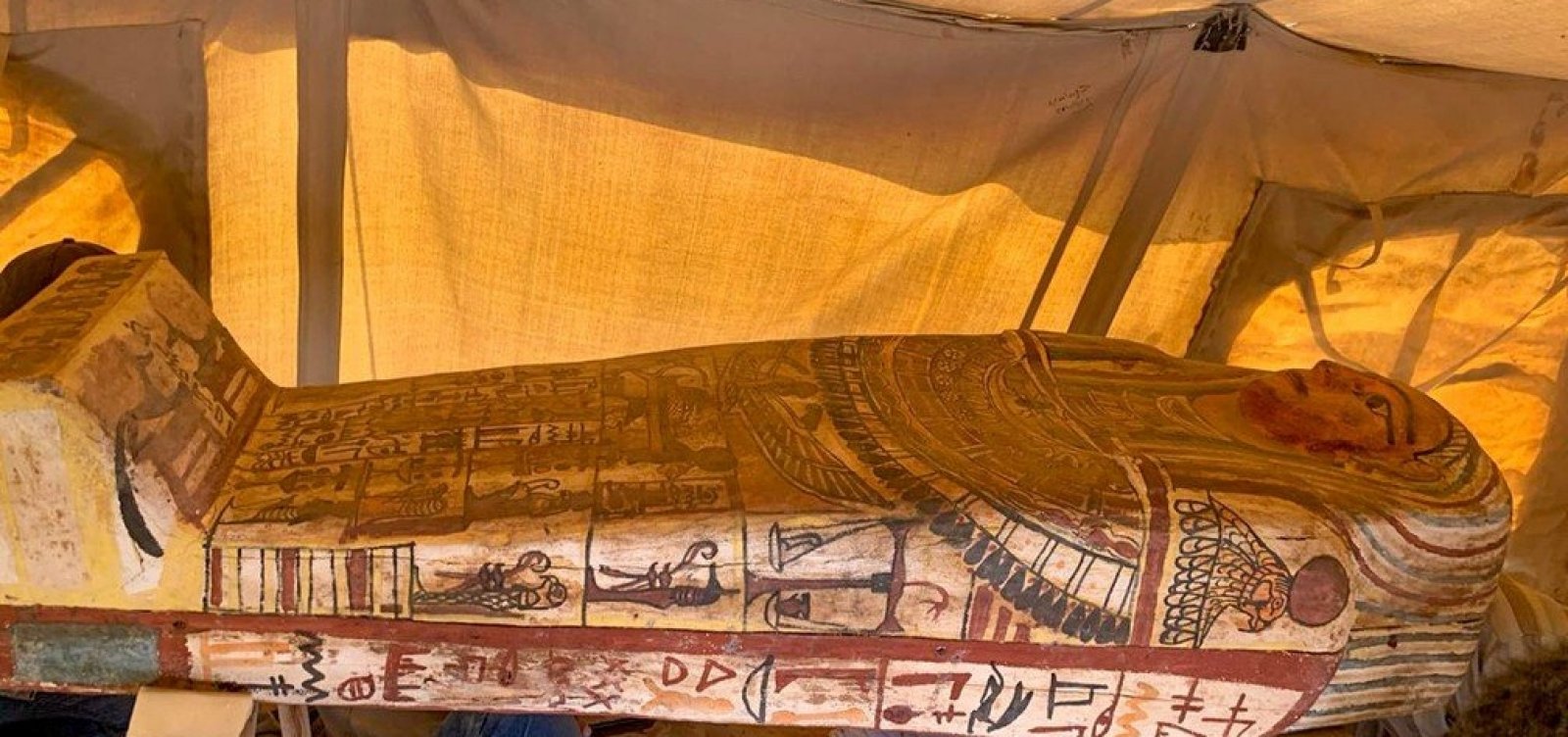 Os sarcófagos estão bem preservados e suas imagens mostram motivos marrons e azuis, bem como numerosas inscrições hieroglíficas. (Metro1)