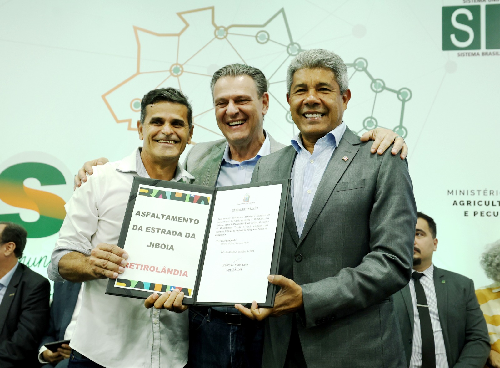 Durante o evento, apresentados produtos certificados em edições anteriores do Consid, Consisal, Sertão do São Francisco, Chapada Forte, Construir e Velho Chico. Um conselho gestor vai indicar um corpo técnico com seis fiscais agropecuários para compor, junto ao Mapa, a equipe de orientação. Na mesma ocasião, o governador ainda autorizou a Secretaria de Infraestrutura (Seinfra) a asfaltar o trecho de 3,2 km do entroncamento da BA-120 ao povoado de Jibóia, em Retirolândia. A pavimentação vai facilitar a mobilidade urbana e o escoamento da produção agrícola.