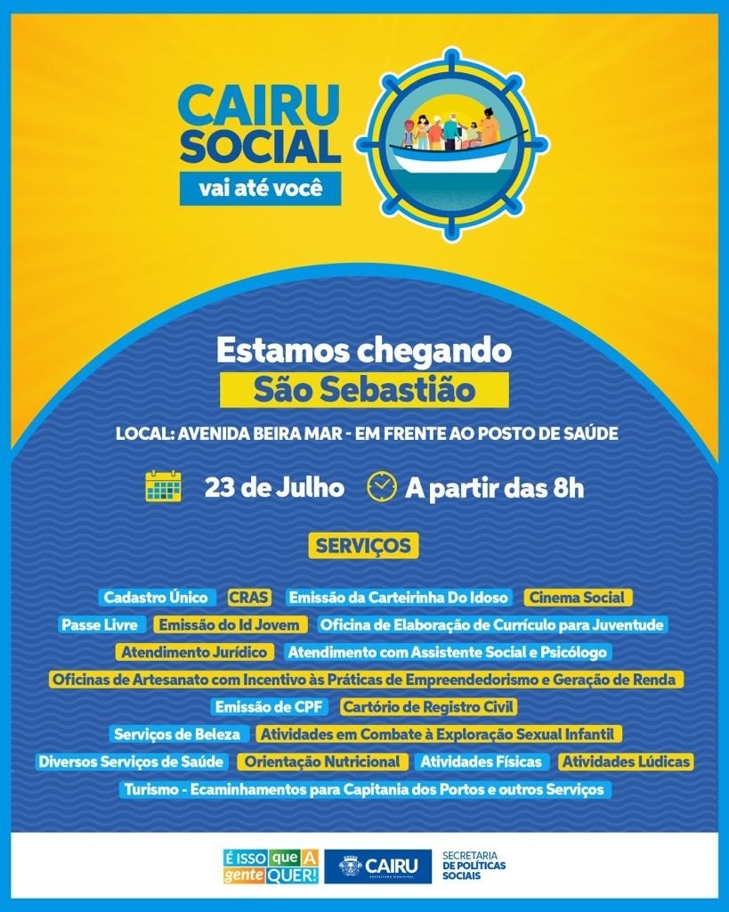 Neste sábado 23, a Prefeitura de Cairu, através das Secretarias de Políticas Sociais e da Saúde, atenderá a comunidade de São Sebastião (Cova da Onça) com o projeto itinerante CAIRU SOCIAL VAI ATÉ VOCÊ.