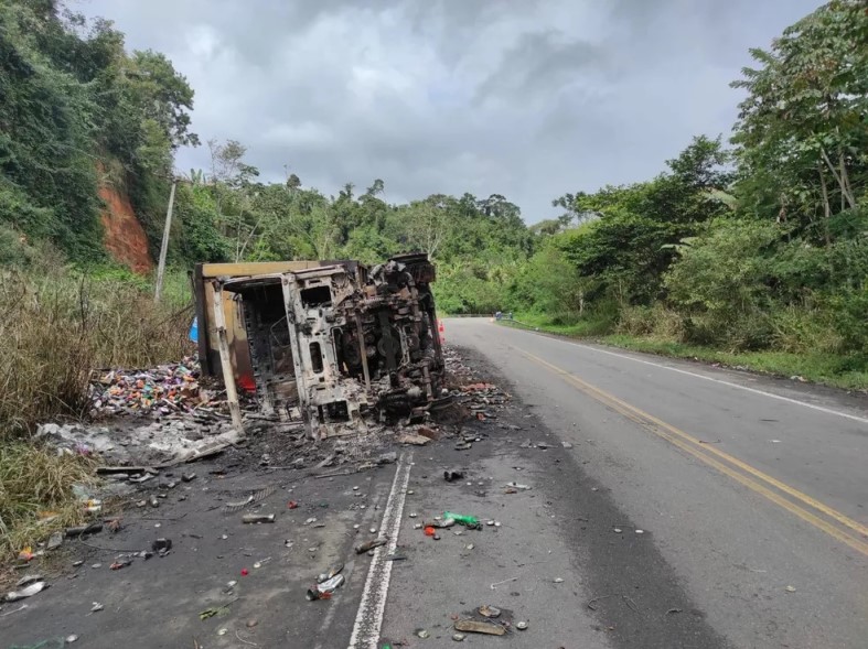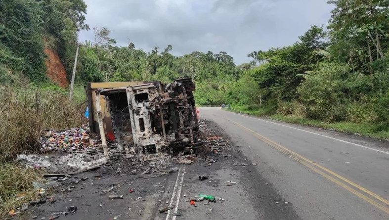 Um caminhão carregado com inseticidas tombou e pegou fogo na BR-101, entre os kms 370 e 380, no trecho da cidade de Gandu, baixo sul da Bahia. O acidente aconteceu madrugada desta quinta-feira (14), por volta das 2h30.