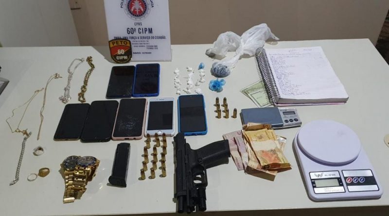 A guarnição deslocou para o local para verificar a veracidade da denúncia. Chegando lá, a guarnição se deparou com dois indivíduos na porta de uma residência. Nesse momento, um rapaz que estava de óculos falou em voz alta: “Perdi! Perdi! Tô armado”. O outro rapaz que estava ao lado dele e usava uma camisa do Bahia jogou uma capa de óculos para trás, caindo na varanda da residência. Ao verificar o interior da capa do óculos os policiais encontraram uma certa quantidade de trouxinhas de cocaína. Na abordagem ao suspeito que havia afirmado estar armado, foi encontrada uma pistola na cintura dele. Ainda durante à abordagem, os militares visualizaram outras pessoas que estavam dentro da residência correndo para os fundos. Os policiais foram atrás e flagraram um rapaz jogando uma sacola dentro do vaso sanitário. Nessa sacola continha uma quantidade de uma substância análoga a cocaína. No fundo da residência foram encontrados mais 3 homens, duas mulheres e uma criança.