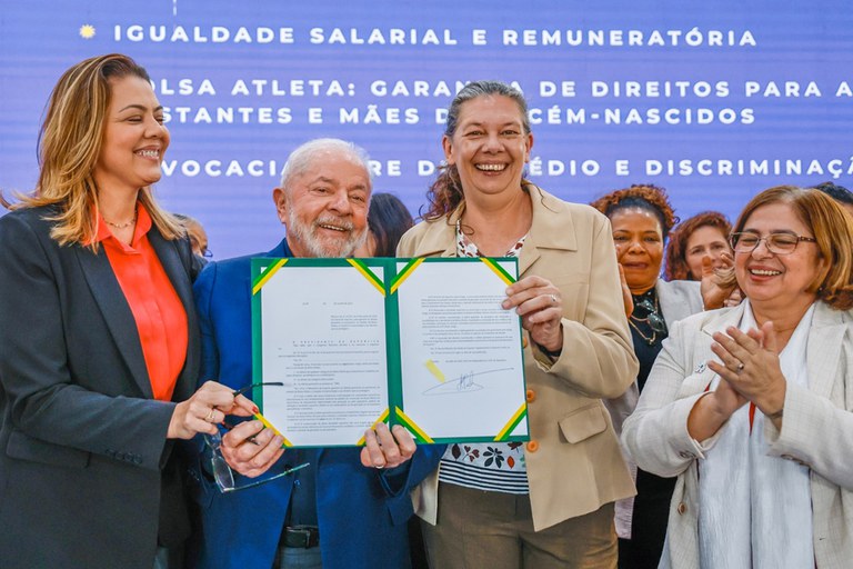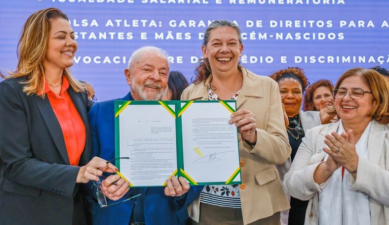 O presidente Lula e a ministra Ana Moser (Esporte) com o texto sancionado da lei que modifica o Bolsa Atleta. A senadora Leila Barros (E) e a ministra Cida Gonçalves (Mulheres) também participaram do ato. Foto: Ricardo Stuckert / PR residente Lula sanciona lei que estende benefícios do programa de patrocínio direto e que simboliza uma conquista importante na igualdade de gênero no esporte. Um novo horizonte para atletas de alto rendimento gestantes e em fase de amamentação se consolidou na tarde desta segunda-feira (3/7), em Brasília (DF). O presidente da República, Luiz Inácio Lula da Silva, sancionou o Projeto de Lei nº 1084/2023, que garante às atletas gestantes ou puérperas a segurança de continuar se beneficiando do Bolsa Atleta – principal programa de suporte ao esporte de alto desempenho no país e um dos principais do mundo. A assinatura foi durante evento na Base Aérea, e também envolveu a sanção da lei que prevê igualdade salarial entre homens e mulheres e a lei que prevê que o assédio a e discriminação passam a ser infrações ao Estatuto da OAB.