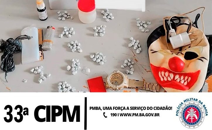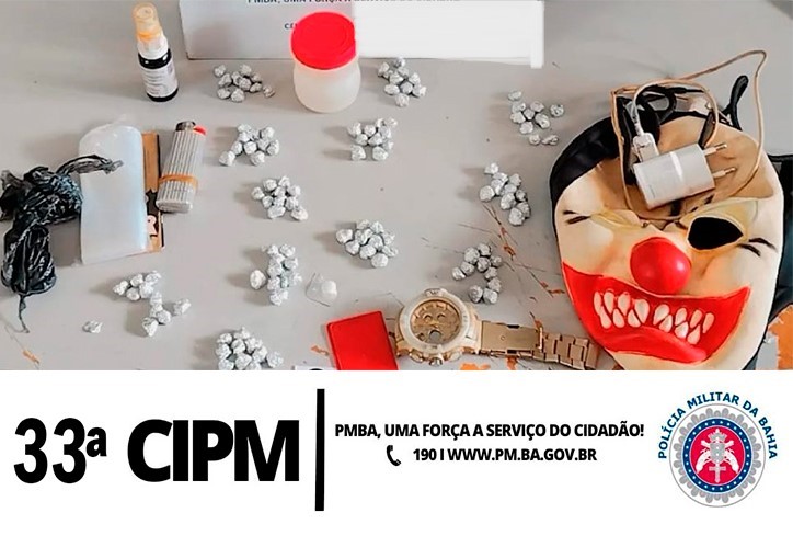 120 pedras de Crack, 01 relógio, 01 máscara de palhaço, material para embalagem, medicamento de nome Ritrotar – rifocina, 01 mochila. Diante do fato o material foi conduzido para a Delegacia Territorial de policia Nike, 01 carregador de celular Samsung, 01 cordão 01 cordão de tecido e 01 foto 3×4 de um homem