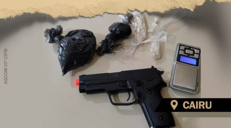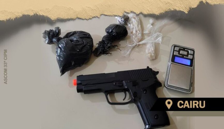 No município de Cairu, a guarnição da 33ª CIPM, sobre o comando do Capitão Rodrigo Chaves, realizava rondas de rotina quando avistou um casal em atitude suspeita. Na abordagem foi encontrado várias substâncias aparentando ser maconha, crack e cocaína, além de um simulacro de uma pistola 9 mm e munições do mesmo calibre.
