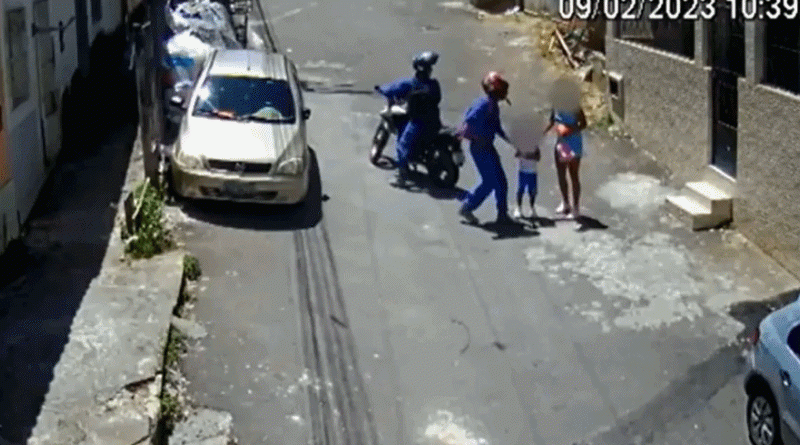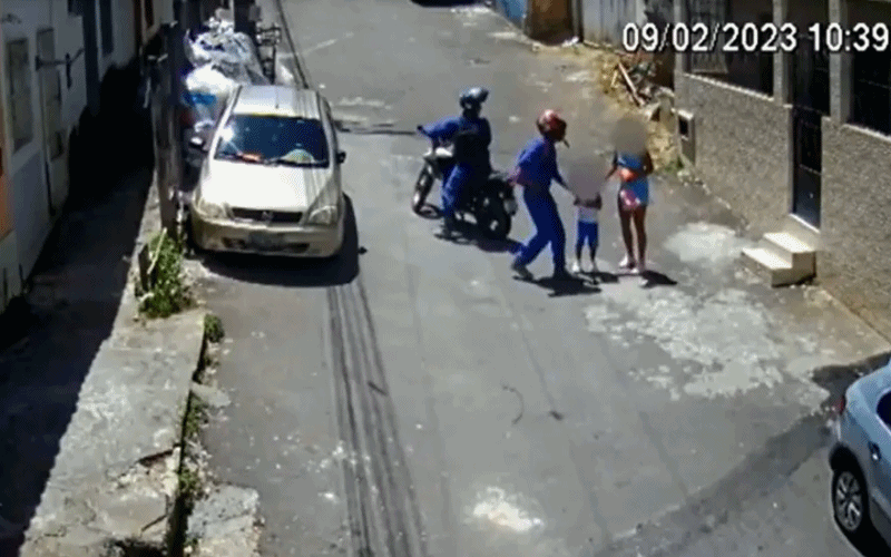 Uma criança de 4 anos voltava da escola com a mãe quando teve o celular roubado, no bairro do IAPI, em Salvador. Imagens de câmeras de segurança mostram o momento em que um homem desce de uma motocicleta e puxa o aparelho da menina.