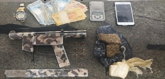 Com o suspeito, foram apreendidos uma submetralhadora artesanal calibre 9mm com carregador, seis munições, uma balança, porções crack, R$ 290, um relógio, um celular e uma mochila.
