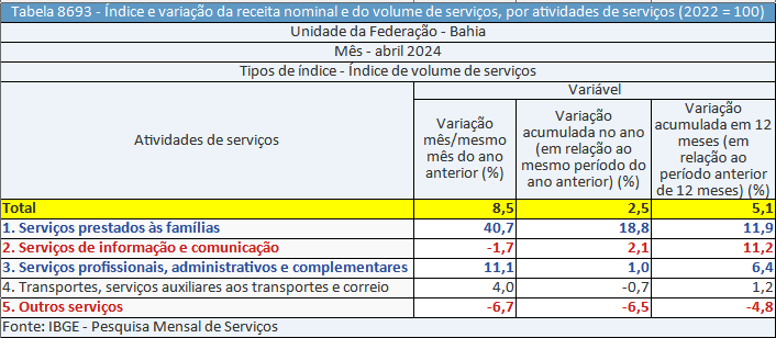 ** Na comparação com abril/23, a alta dos serviços baianos ocorreu em 3 das 5 atividades, puxada principalmente pelos serviços prestados às famílias (+40,7%);