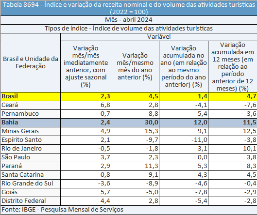 ** Em abril, as atividades de serviço ligadas ao turismo na Bahia cresceram frente a março (2,4%) e registraram o melhor resultado do país na comparação com abril de 2023 (30,0%).