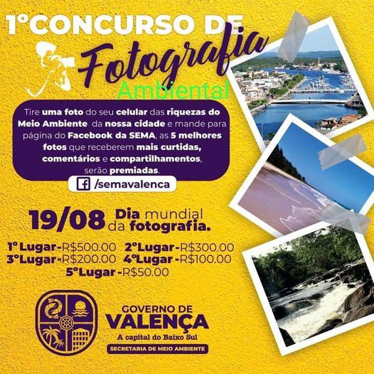 As inscrições vão até o dia 30 de junho deste ano e as fotografias enviadas devem ser a respeito das paisagens naturais e ambientais de Valença. O concurso é uma iniciativa da Prefeitura de Valença através da Secretaria de Meio Ambiente (Sema).
