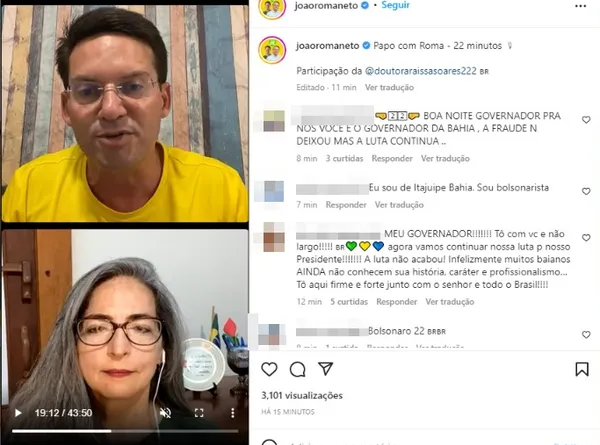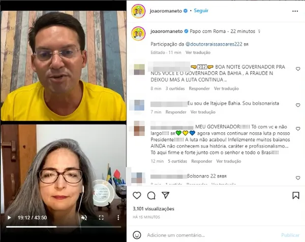 “Não depende da gente. Depende do candidato. O apelo que vocês [público da live] estão fazendo para nós [aliança com ACM Neto] tem que feito ao candidato”, afirmou Raíssa Soares.