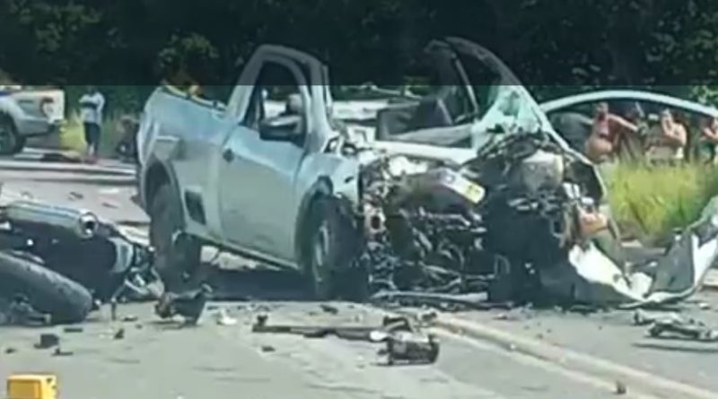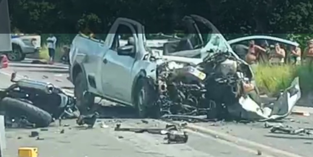 Uma Volkswagen Saveiro e uma moto colidiram frontalmente. O impacto deixou os corpos mutilados; os veículos ficaram destruídos. Ainda não há informações sobre o que motivou o acidente e o estado de saúde dos ocupantes do carro.
