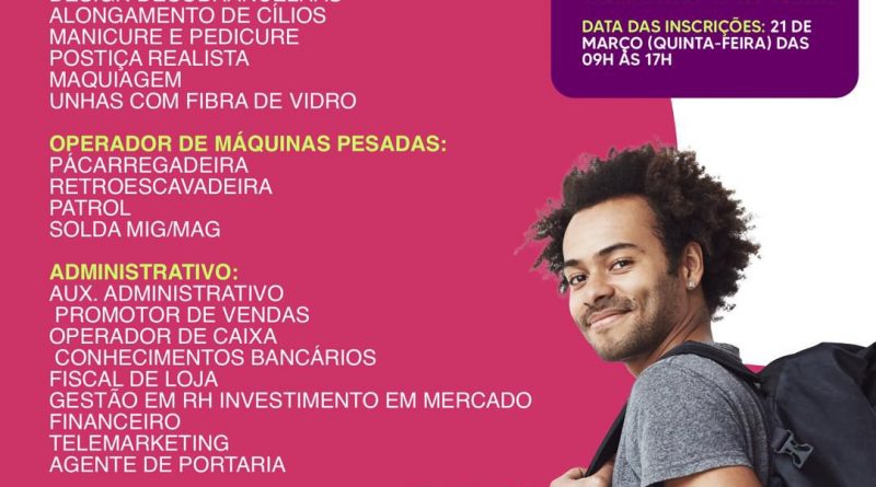 As inscrições acontecerão no auditório do Grupo Escolar Nair Lopes Jenkins, nesta quinta-feira, dia 21 de março, das 09 às 17 horas. Uma grande oportunidade de adquirir novos conhecimentos e se qualificar profissionalmente.