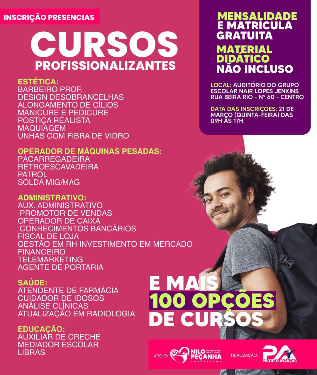 O projeto Avançar, com total apoio da Prefeitura Municipal de Nilo Peçanha, está ofertando diversos cursos profissionalizantes, com aulas teóricas e práticas para toda a população.