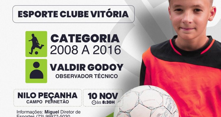 No próximo domingo dia 10 de novembro, a Prefeitura Municipal de Nilo Peçanha, por meio da Diretoria de Esportes, realizará uma avaliação esportiva em parceria com o Esporte Clube Vitória, voltada para jovens nascidos entre 2008 e 2016. A ação contará com a presença do observador técnico Valdir Godoy, representando o clube baiano, e visa identificar talentos locais para possível integração à base do Vitória.
