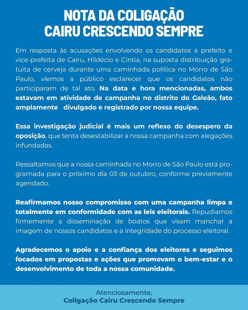 Em resposta às acusações envolvendo os candidatos a prefeito e vice-prefeita de Cairu, Hildécio e Cíntia, na suposta distribuição gratuita de cerveja durante uma caminhada política no Morro de São Paulo, viemos a público esclarecer que os candidatos não participaram de tal ato. Na data e hora mencionadas, ambos estavam em atividade de campanha no distrito do Galeão, fato amplamente divulgado e registrado por nossa equipe.