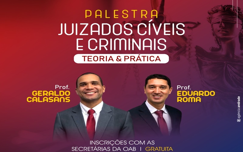 As inscrições já estão abertas e podem ser realizadas na diretamente com as secretárias da OAB- Valença. A palestra será ministrada pelo professor universitário Geraldo Calasans, advogado, juiz leigo e Mestre em Direito pela UFBA; e também pelo professor universitário Eduardo Roma, advogado, juiz leigo e Especialista em Direito Processual.