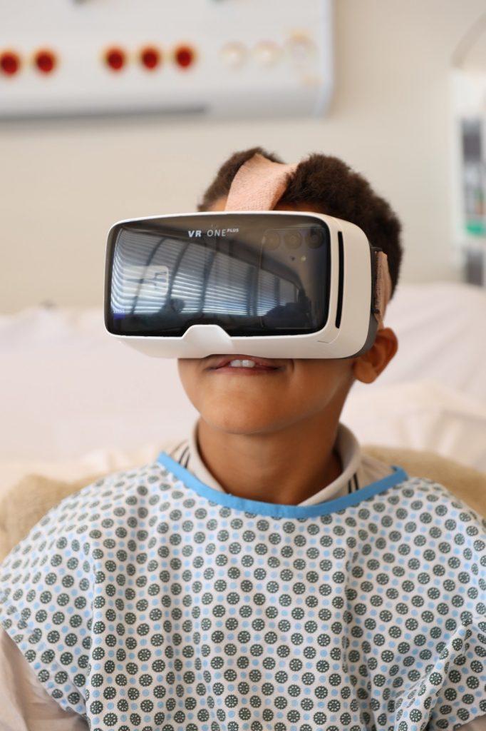 Luiz Otávio Souza, de 9 anos, paciente da ala pediátrica do Hospital Ortopédico do Estado (HOE), sofreu uma lesão óssea, com suspeita de infecção, no dedo do pé direito, ao jogar bola. Há 15 dias internado, ele tem experimentado os óculos de realidade virtual como parte do tratamento para auxiliar na reabilitação. A tecnologia ajuda na melhora da função motora, do equilíbrio e na redução da dor durante o processo de recuperação.