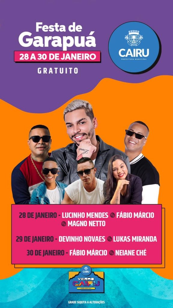 Entretenimento Festa em Garapuá ocorre neste fim de semana 28 de janeiro de 202328 de janeiro de 2023 Atualiza Bahia 0 ComentárioJaneiro finaliza com três dias de festas da programação especial de verão, em Garapuá – Cairu. A programação iniciará no dia 28 até o dia 30. Confira abaixo:
