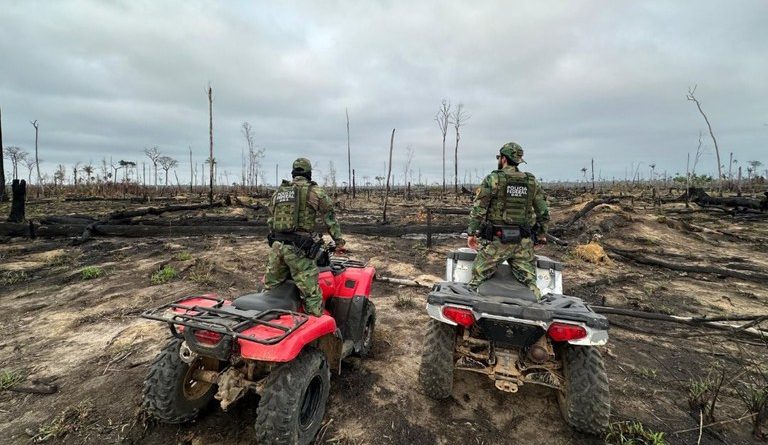 AMAZONAS — Nos municípios de Boca do Acre e Lábrea, região sul do estado do Amazonas, policiais federais identificaram 250 hectares de mata nativa derrubada e queimada, evidenciando o ciclo criminoso que associa o desmatamento ilegal ao uso de fogo para degradação do bioma. O local também abrigava uma série de materiais utilizados no desmatamento, como motosserras, galões de combustível e óleo de motor, além de armas de fogo, o que confirma a estrutura montada para a prática delituosa. Um indivíduo foi preso em flagrante e, juntamente com os equipamentos apreendidos, foi conduzido à Base Integrada Araçari, situada em Boca do Acre (AM), onde atuam de forma coordenada a Polícia Federal, a Força Nacional e o ICMBio.