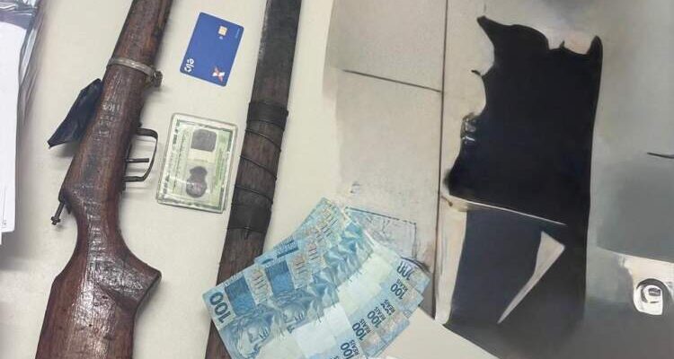 No local, a guarnição encontrou uma espingarda artesanal carregada e pronta para uso, um facão tipo “biscó”, além de cerca de R$ 800 em espécie e três cartões bancários.