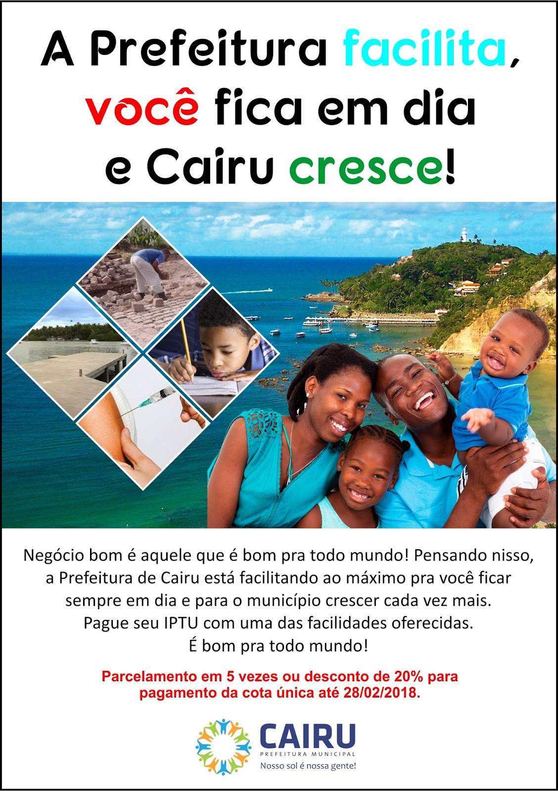 Últimas Prefeitura de Cairu dá desconto de 20% no IPTU em cota única até 28 de fevereiro 7 de fevereiro de 2018 Atualiza Bahia 0 ComentárioA Prefeitura de Cairu divulgou nesta terça-feira (6) que os cairuenses podem parcelar em cinco vezes o IPTU ou ter um desconto de 20% para o pagamento em cota única até 28 de fevereiro.